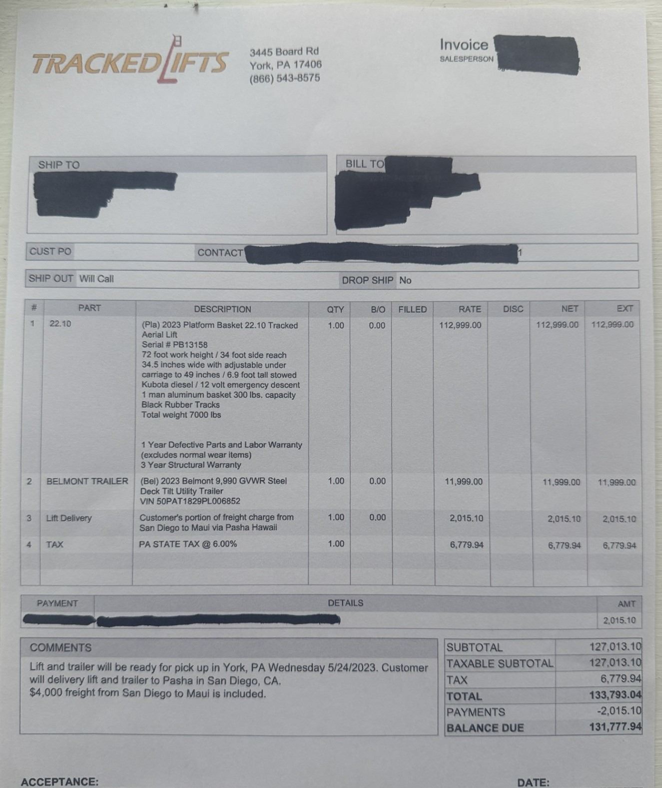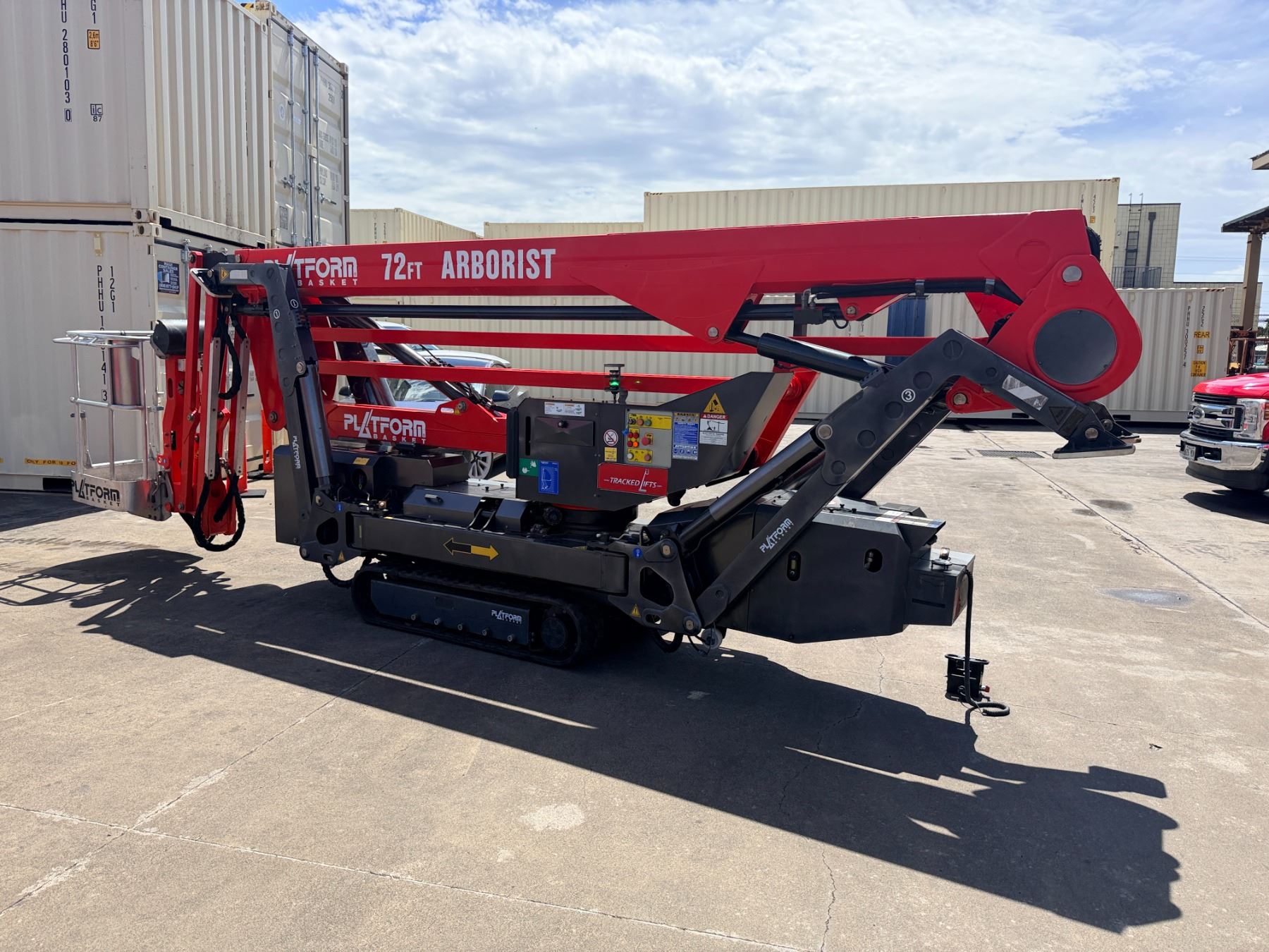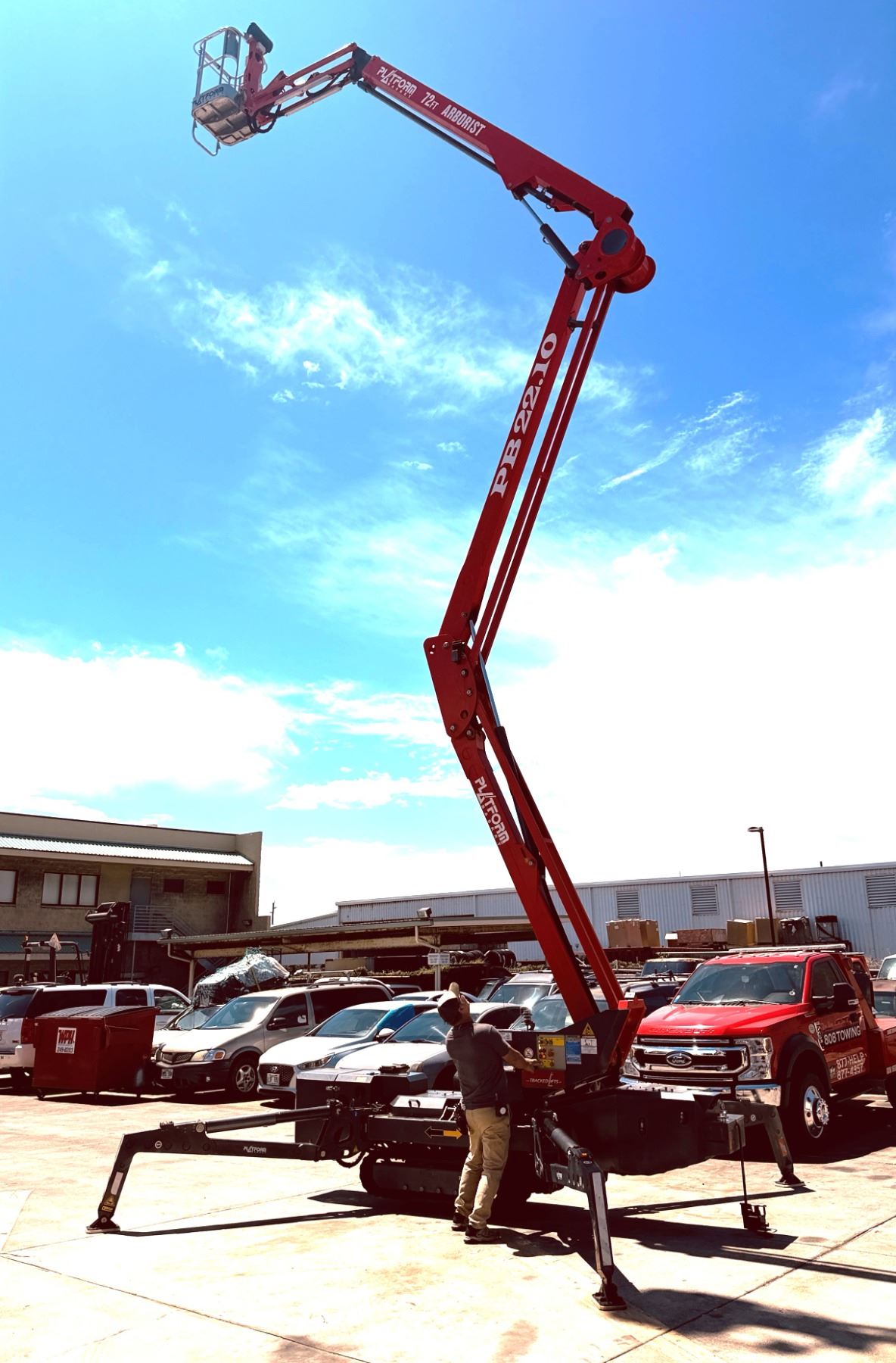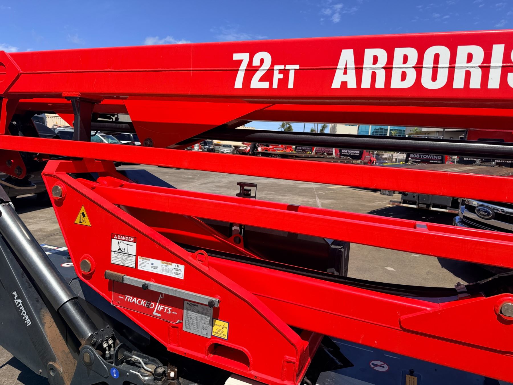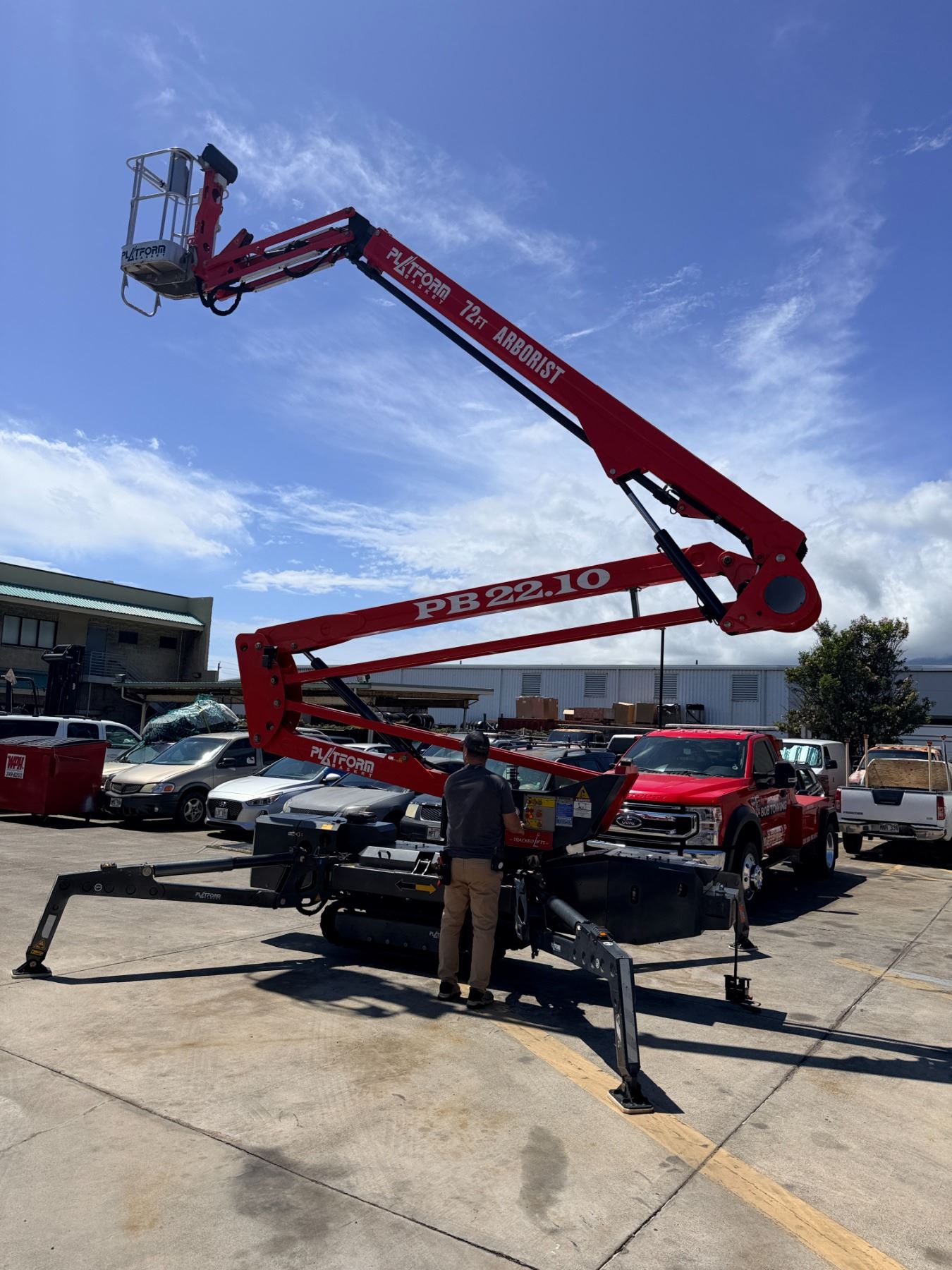 2023 Arborist Track Articulating Aerial Lift with approx. 72-foot working height, 34-foot side reach and stabilizing outriggers to handle uneven terrain. This was purchased from the manufacturer in May of 2023 and shipped to Hawaii from the U.S. mainland. Includes a Belmont utility steel-deck tilt trailer for easy transport. Trailer has no registration, title or paperwork and none will be provided. Trailer was also shipped to Hawaii at the same time. This unit is offered as-is, where-is with no guarantees or representations. Total paid with tax and shipping was $133,793.