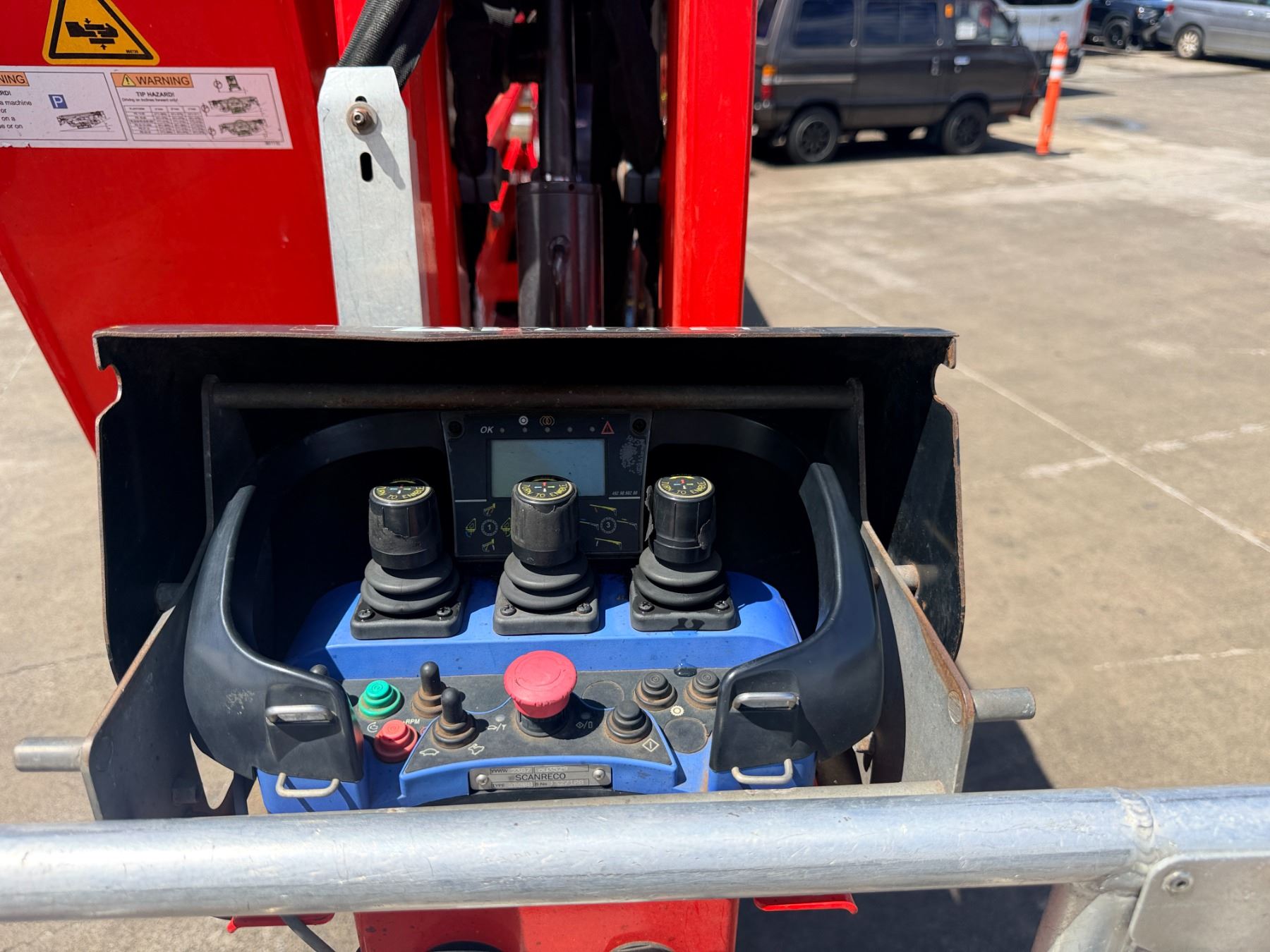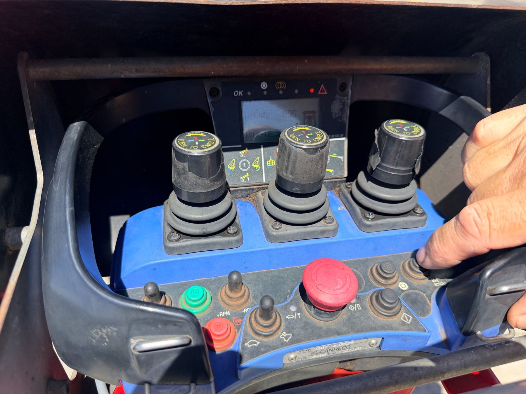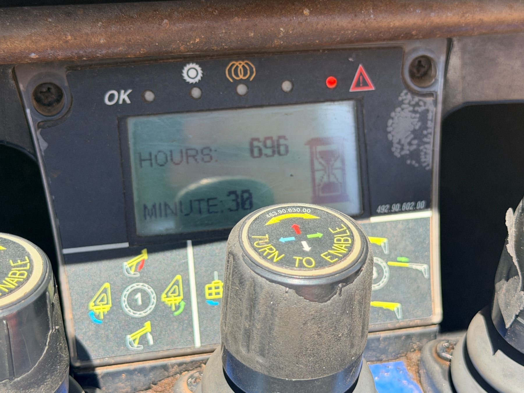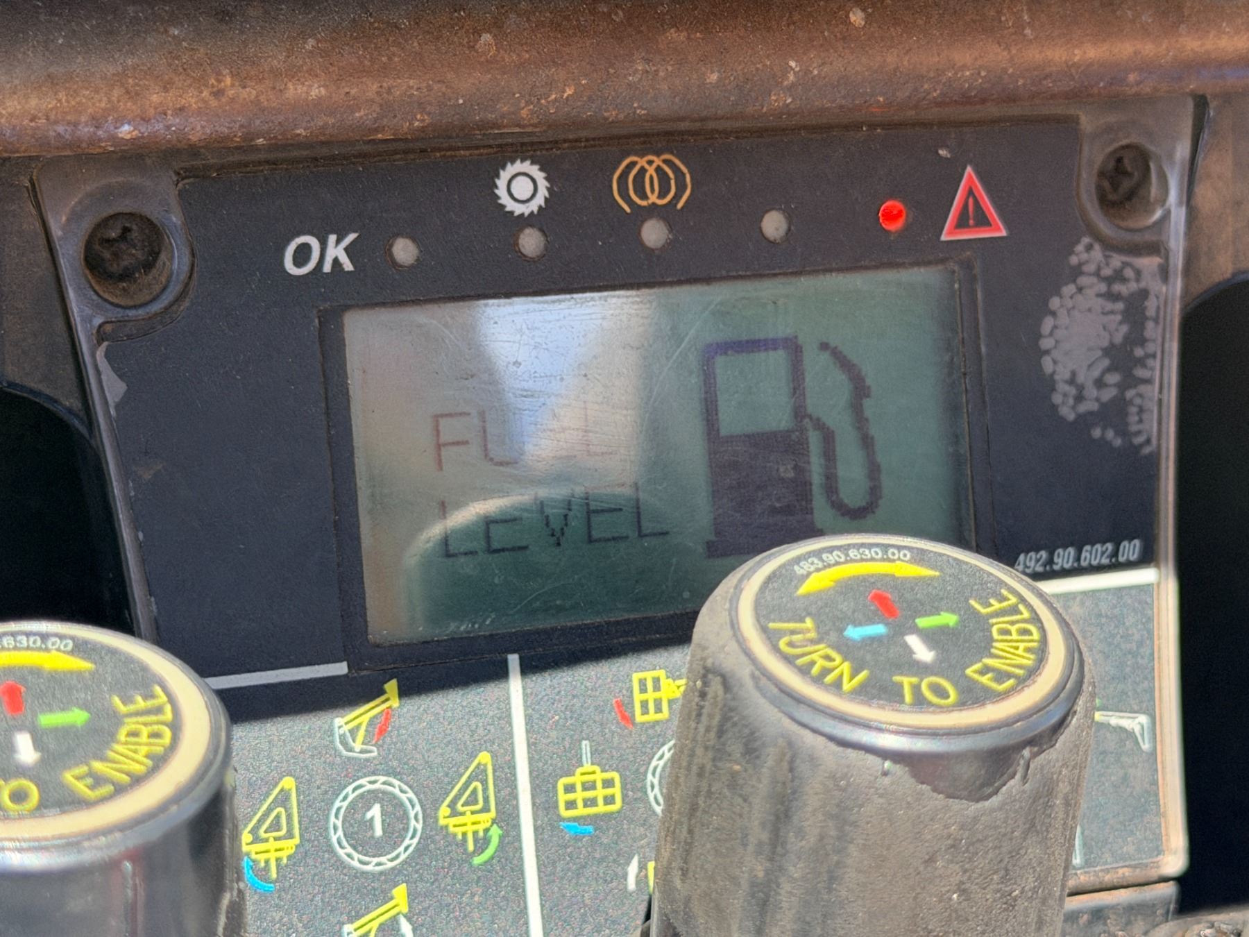 During intake and documentation the machine was started and functions were cycled. The fuel level alarm remained illuminated during operation and is visible in the photos. There may be a slight variation in the hours displayed.