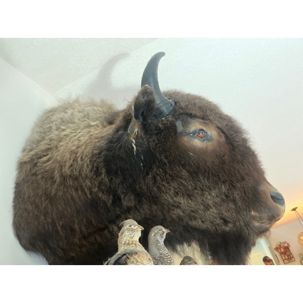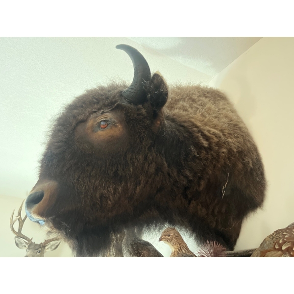 Amazing bison, head shoulder mount history is part of Hinton's Pub History