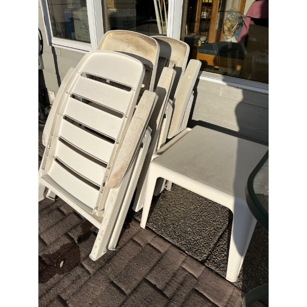 Three plastic, folding chairs and white plastic side table