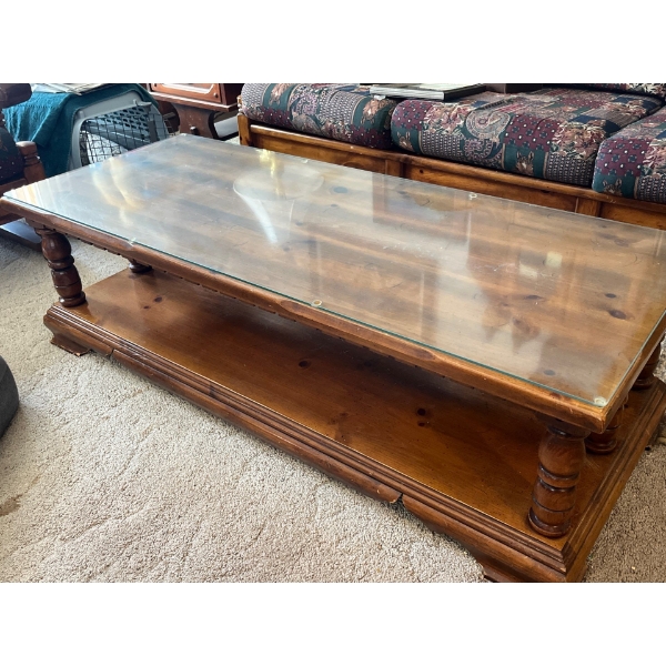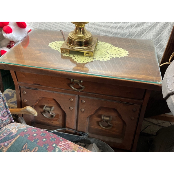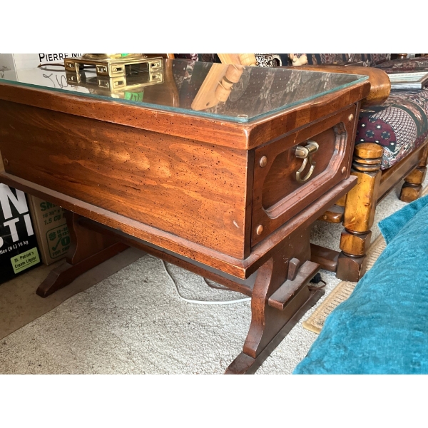 full set of Vintage-Retro end tables 21” h 27”d x19 w coffee table 16”h 21”w 54 Land two small storage end tables 24H 25” w 15” D all solid wood in great condition all have custom glass tops.
