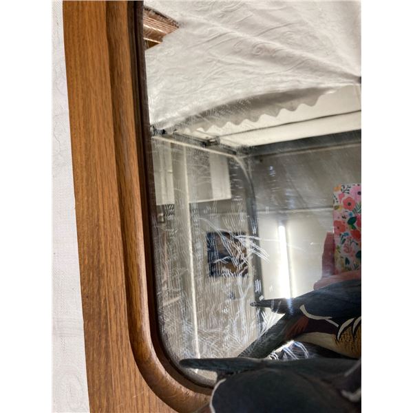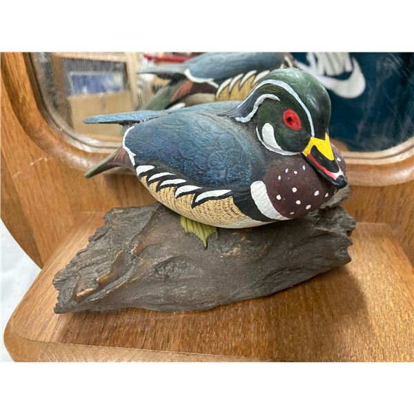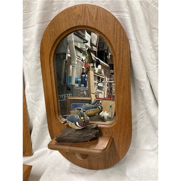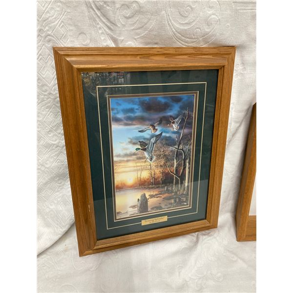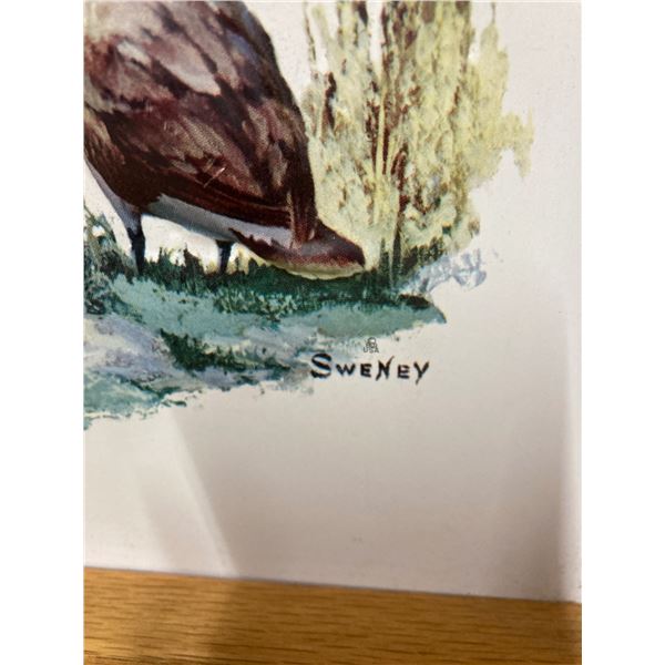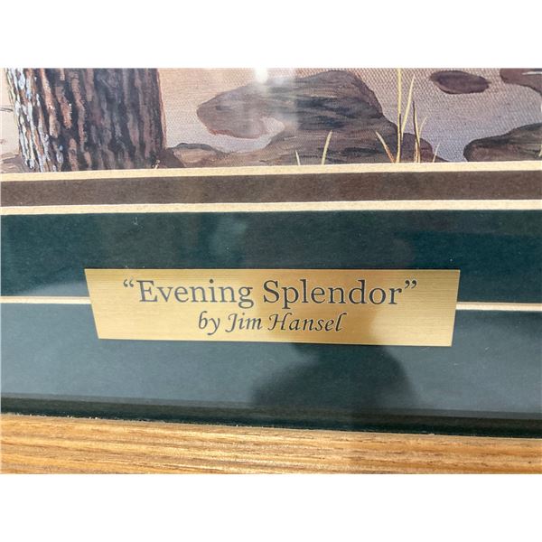 "EVENING SPLENDOR" BY AMERICAN WILDLIFE ARTIST JIM HANSEL; FRAMED ART PRINT OF CANADA GEESE BY THE ARTIST FRED SWENEY; FROSTED GLASS MIRROR WITH DUCK DECOY