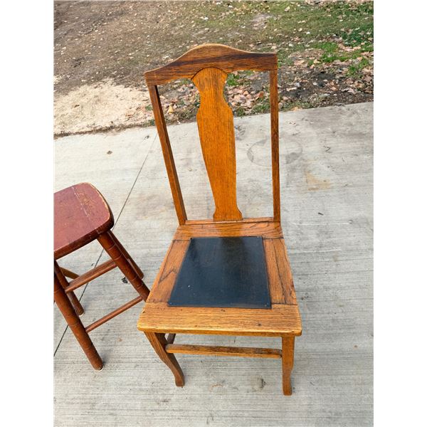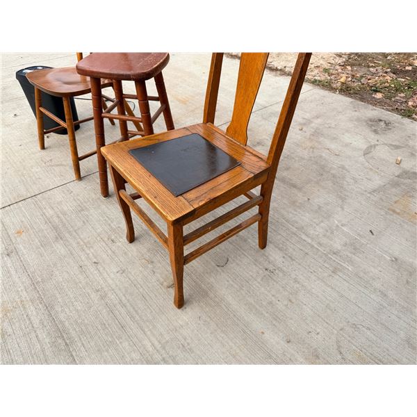 ONE CHAIR IS OAK WITH A LEATHER SEAT PAD
