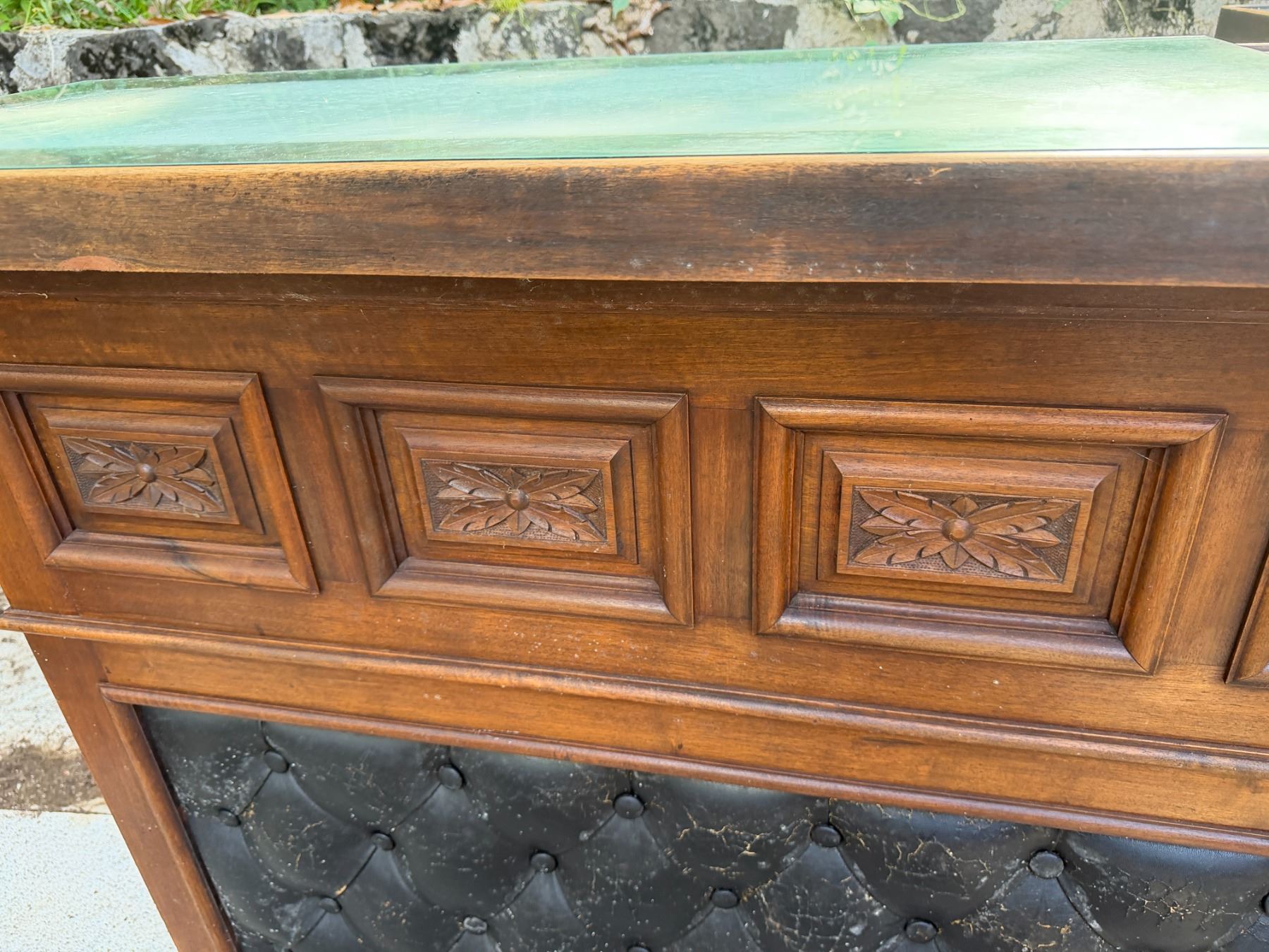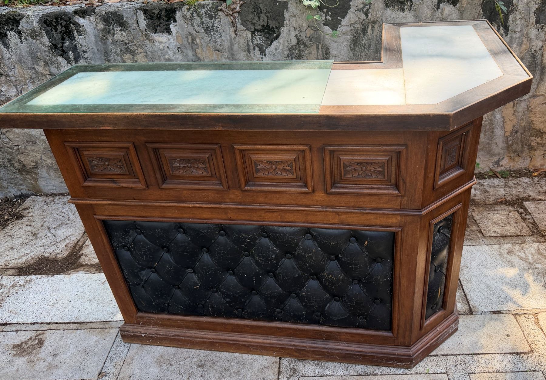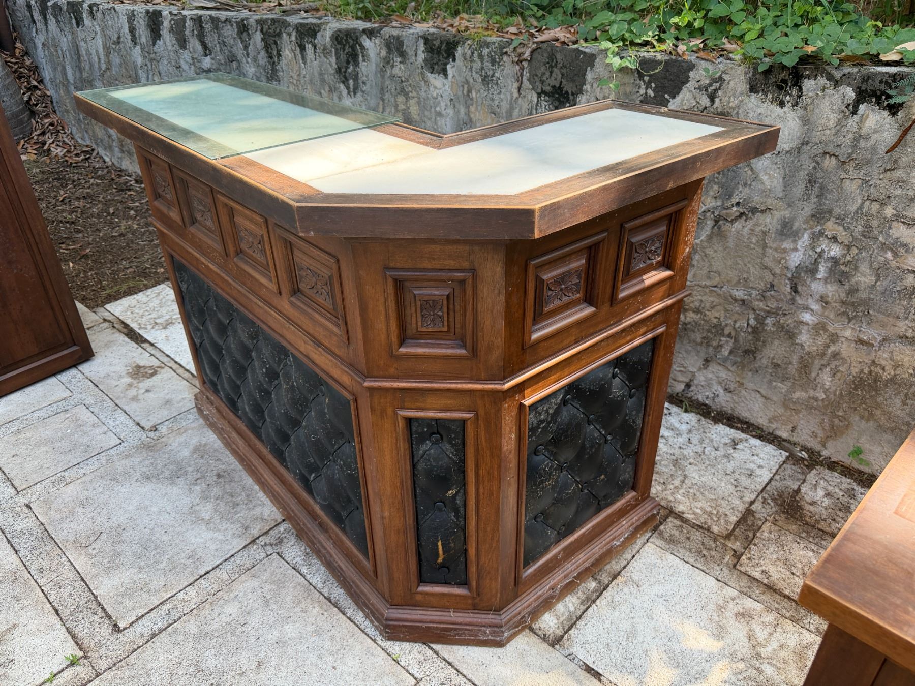 Lot 30 Wooden L-Shaped Bar w/ Black Tufted Panel, Clear Top & Rear Shelving 60" x 36" x 44"H