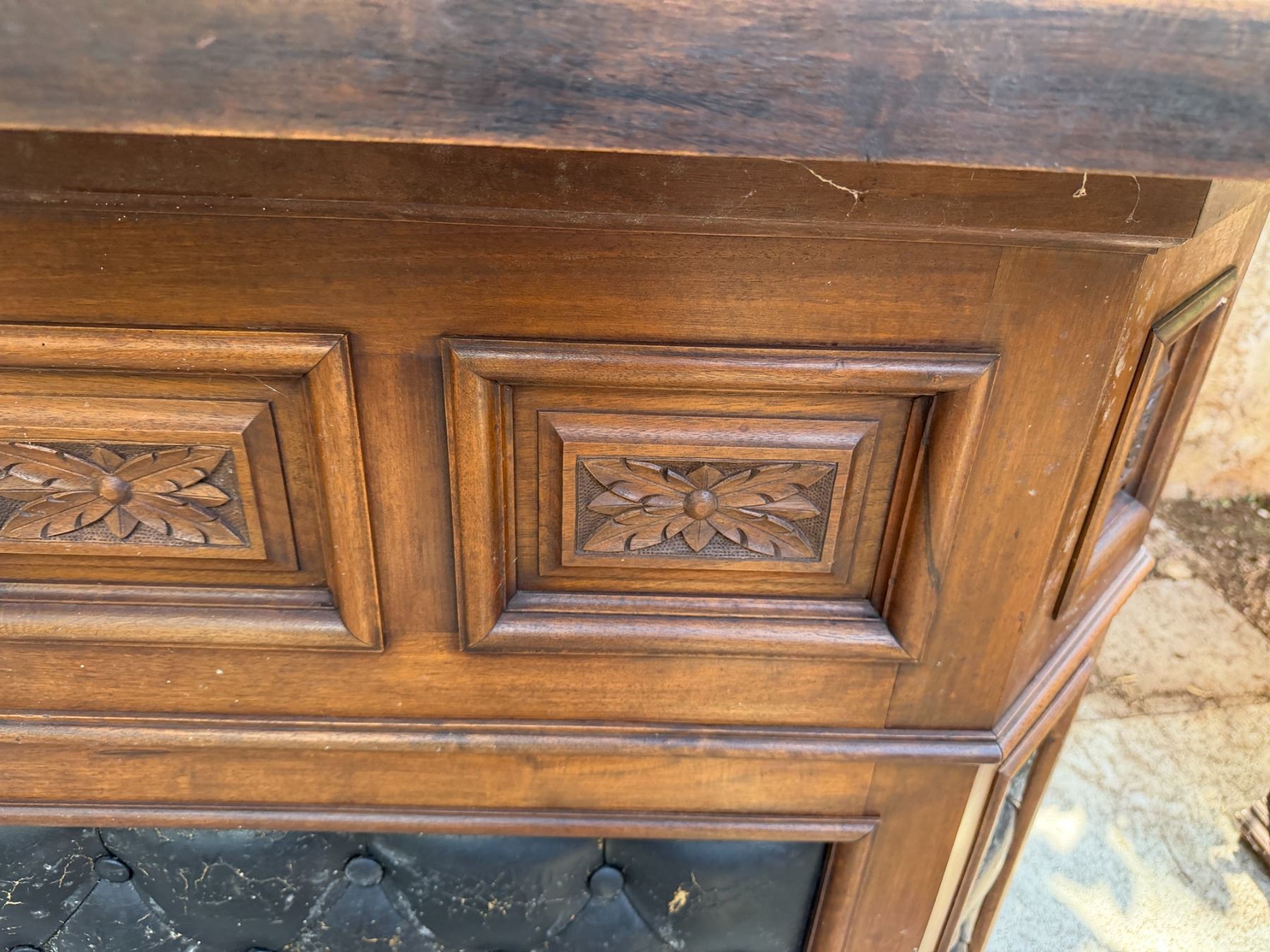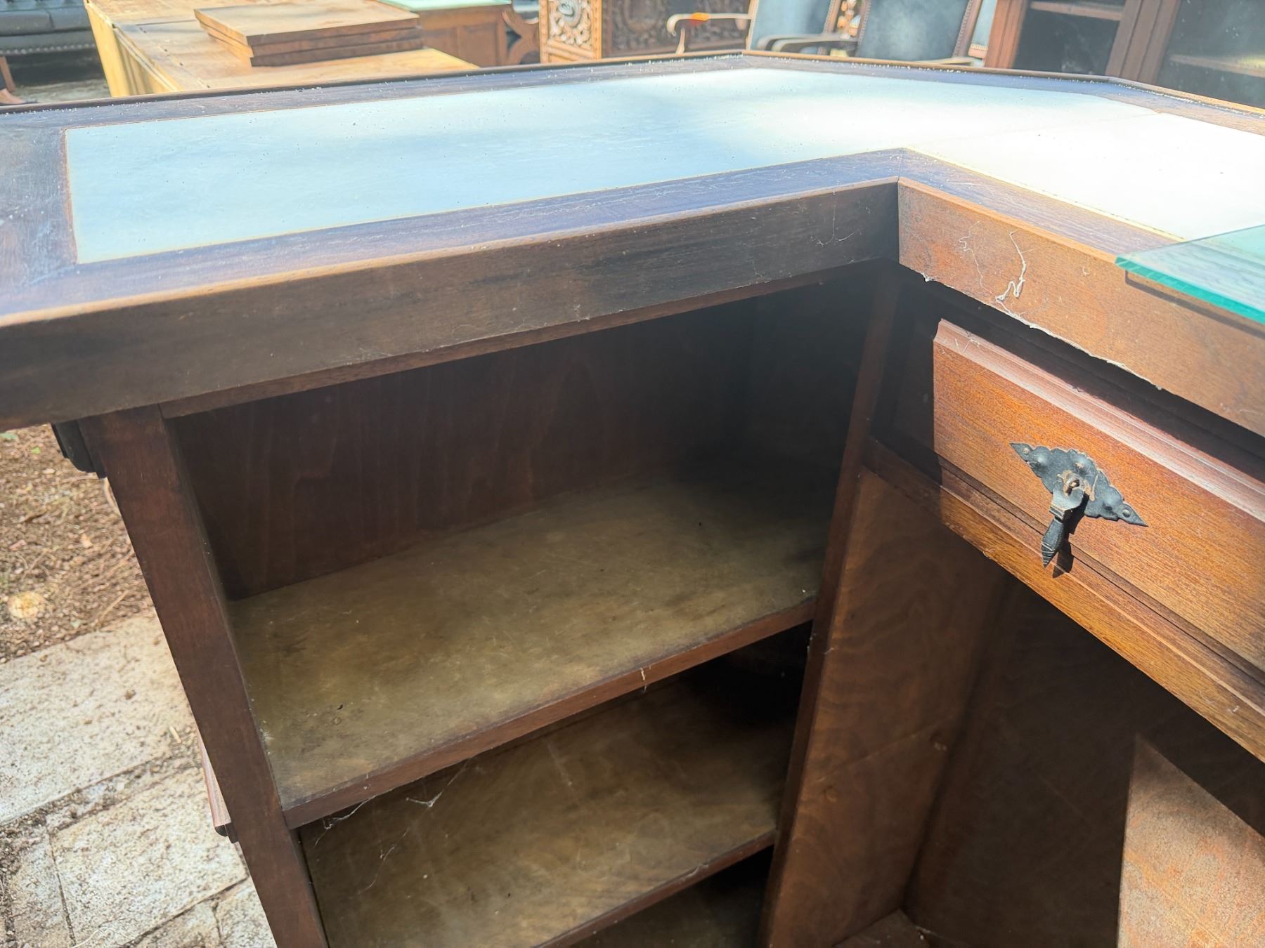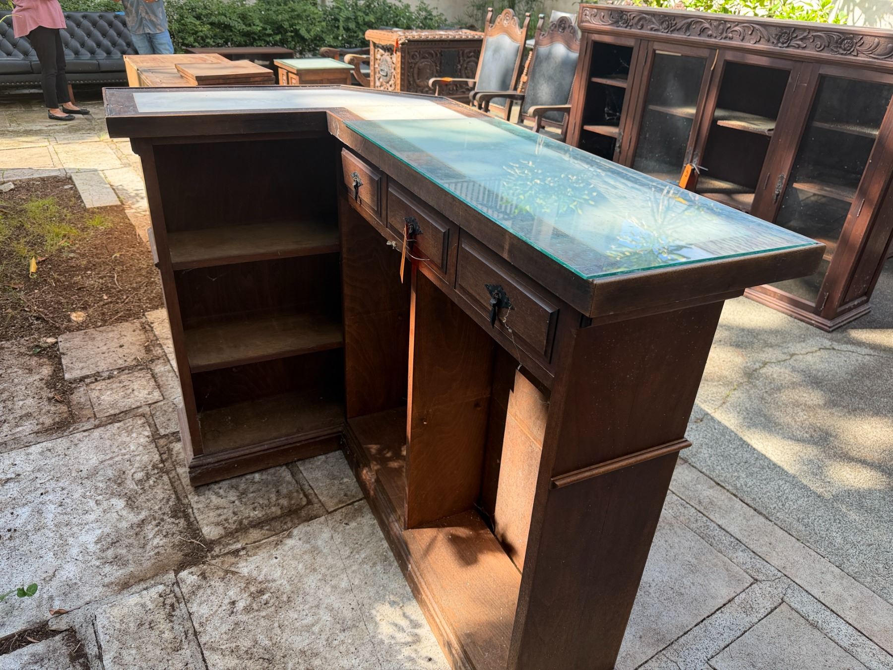 Wooden L-Shaped Bar w/ Black Tufted Panel, Clear Top & Rear Shelving 60" x 36" x 44"H