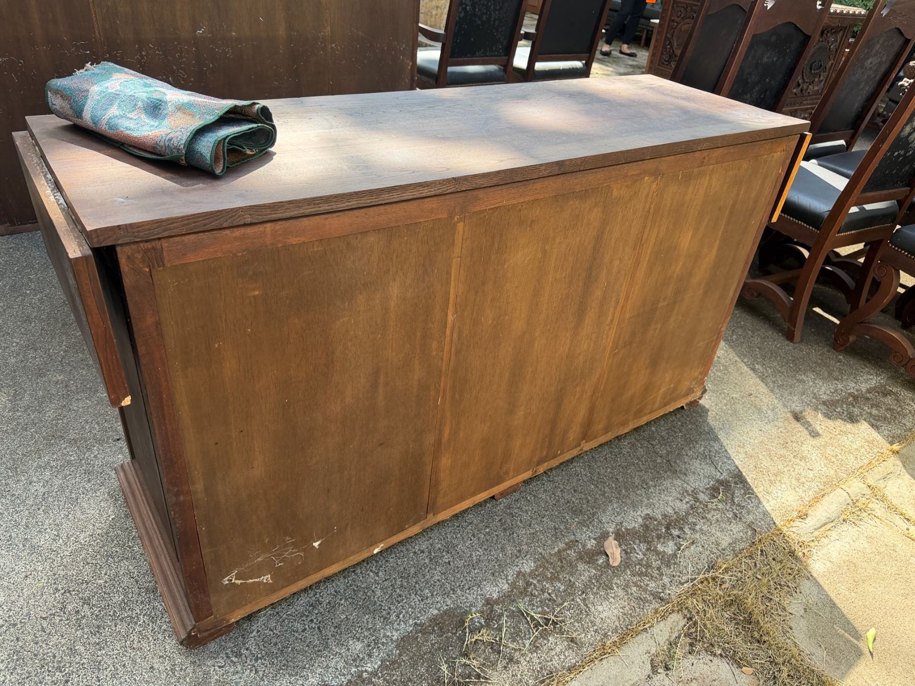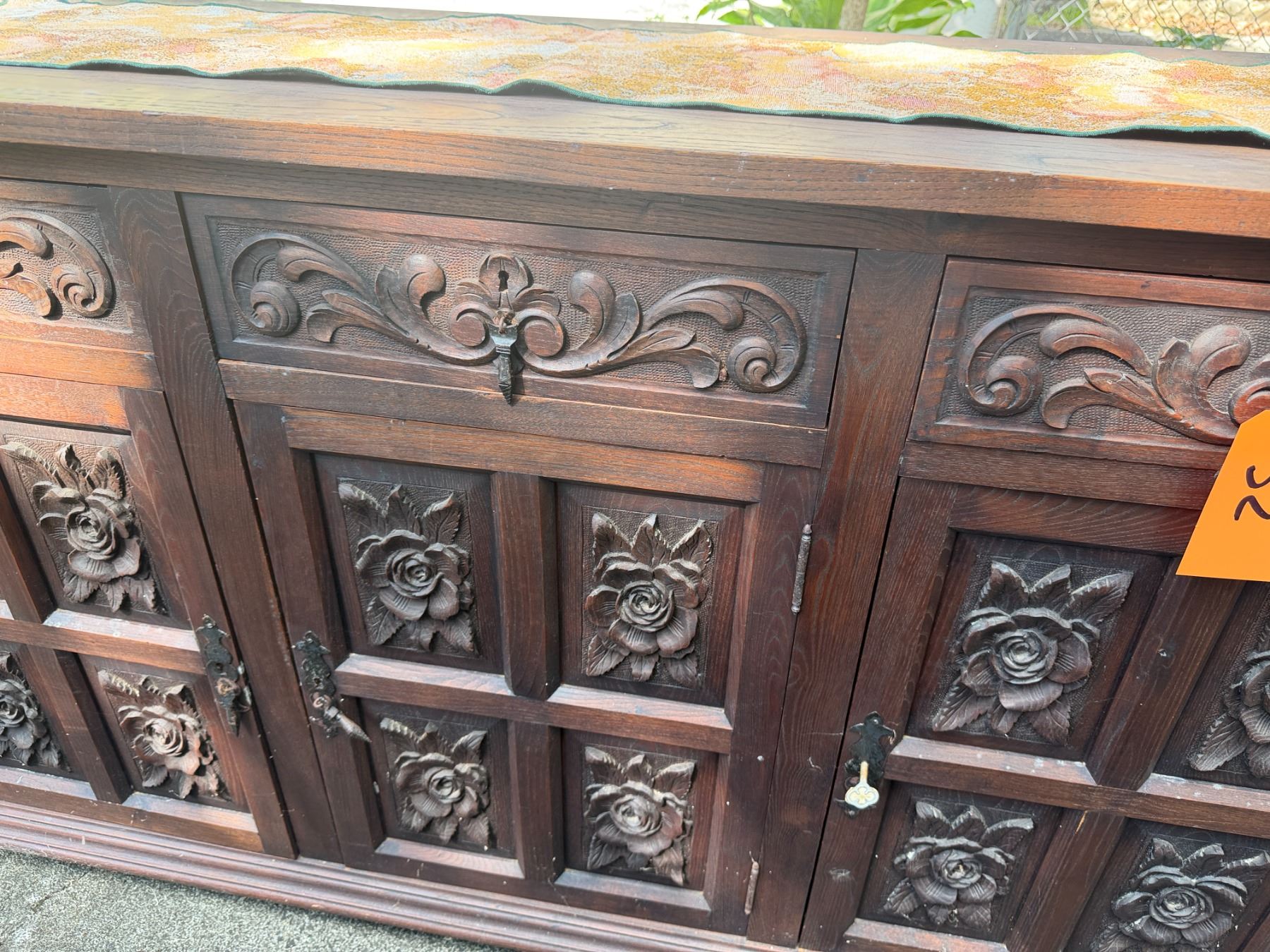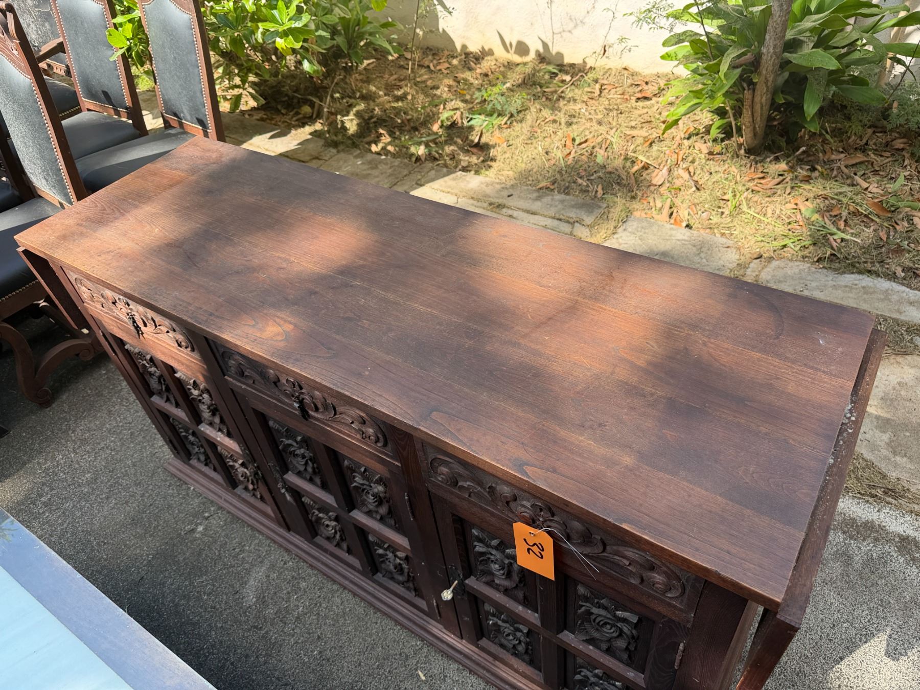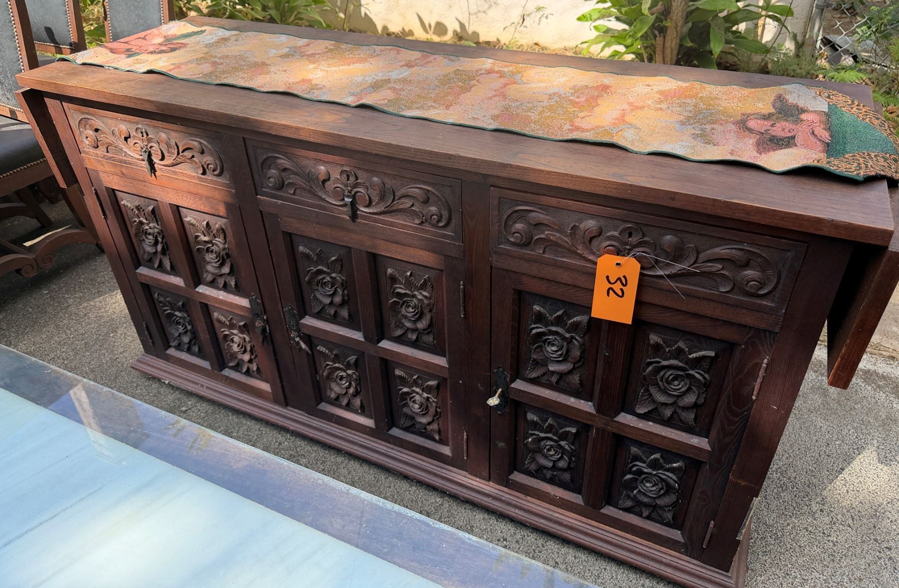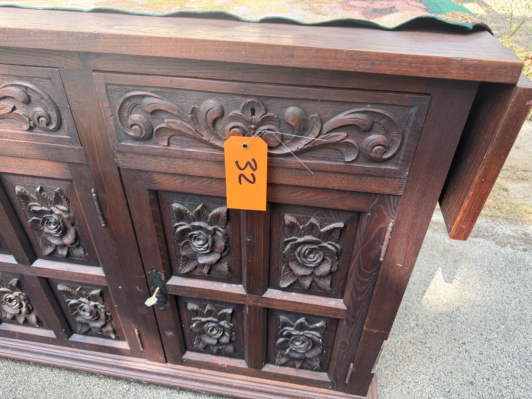 Lot 32 Carved Wooden Sideboard Cabinet w/ 3 Doors, 3 Drawers & Folding Leaf Top 62" x 20" x 33"H