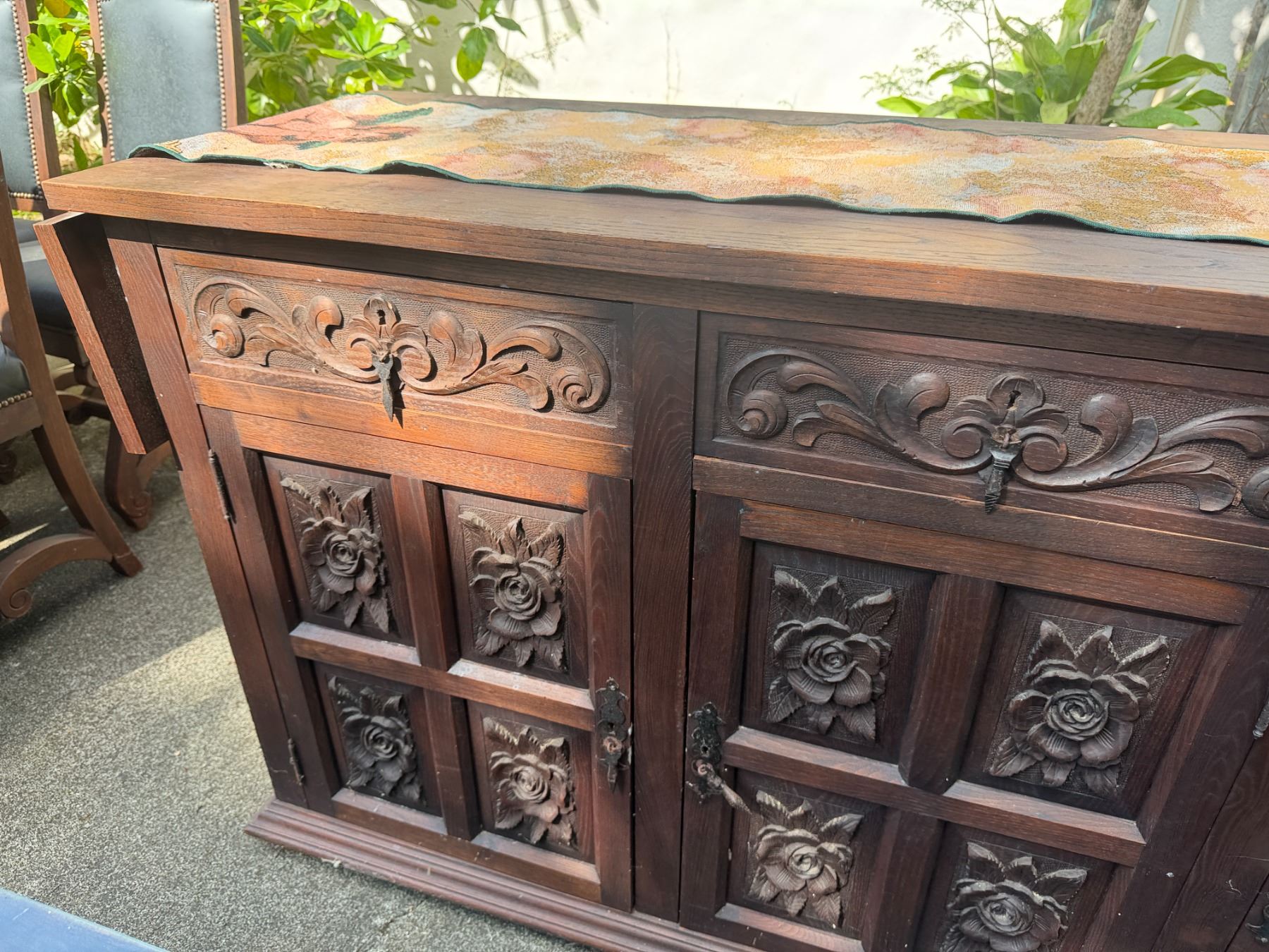 Carved Wooden Sideboard Cabinet w/ 3 Doors, 3 Drawers & Folding Leaf Top 62" x 20" x 33"H