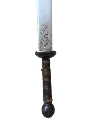 Silver resin sword with brown cord wrapped grips and intricate flame design on the end of the sword near the grip, flame design also on the top of the handle, tip of sword slightly bent.(36x4)