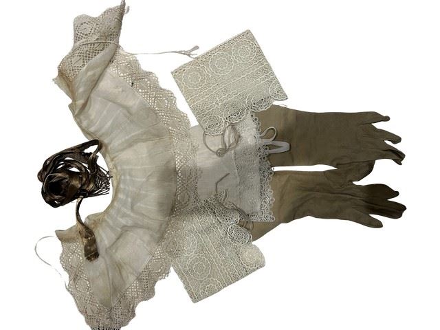Johan De Bye (Kevin McKidd) screen worn, tan suede, tall, custom made riding boots (approximate size 41), linen rectangle scarf with white lace on the edge, two lace and linen boot tops sewn into the boots, a linen collar trimmed with lace, pale cream, plain, gauntlets/ gloves and tan, suede gloves with fancy gold braid and trim. Includes a costume department wardrobe continuity page.