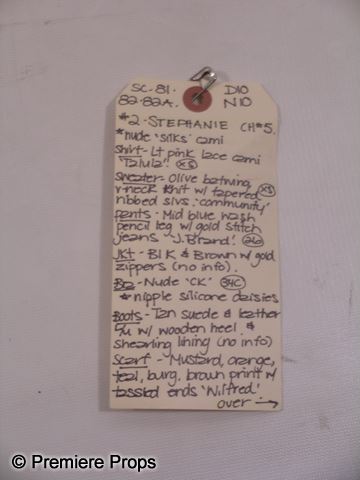 Stephanie (Kyra Sedgwick) screen worn, hero, black and brown zip up the front jacket, olive v-neck cashmere 'Community' sweater, (size XS) light pink with lace 'Talua' camisole, (size XS) multicolor scarf, medium blue was 'J. Brand' jeans, and tan suede and leather with wood heal boots. Includes wardrobe tag!