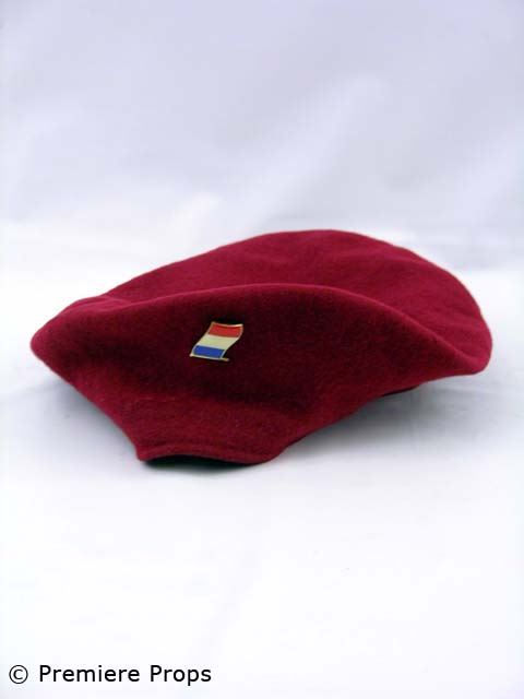 Charlie (Anton Yelchin) tan w/ belt "London Fog" trench coat (size S), black washed faded "Banana Republic" jeans (size 29 x 32), deep red s/s "American Apparel" t-shirt (size S), deep red wool w/ French flag pin beret (no size), brown leather w/ brass buckle and cream threading "Banana Republic" belt (no size) (includes wardrobe tags)