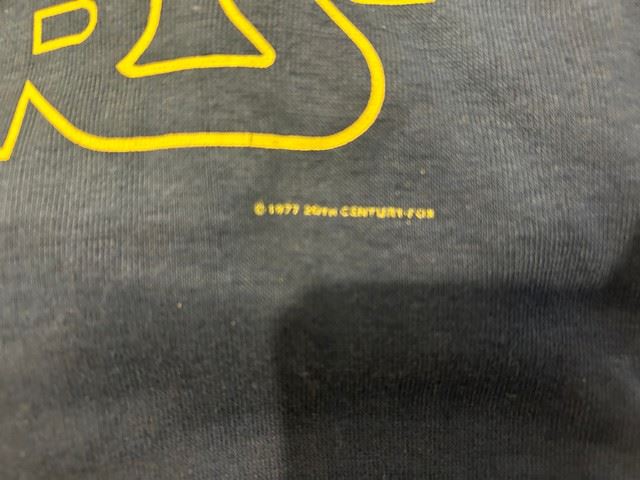 This is a vintage Star Wars T-Shirt from the original 1977 movie. It features a screen printed graphic and is in an unworn condition. The shirt is sized L (38-40), made by Sportique. The design features iconic imagery from the movie and came from someone who worked on the film.