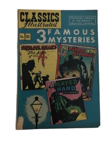 Issue #21 – Three Famous Mysteries (1944) A thrilling anthology featuring Sherlock Holmes, The Murders in the Rue Morgue by Edgar Allan Poe, and The Flayed Hand by Guy de Maupassant. A must-have for fans of classic detective fiction and supernatural suspense.