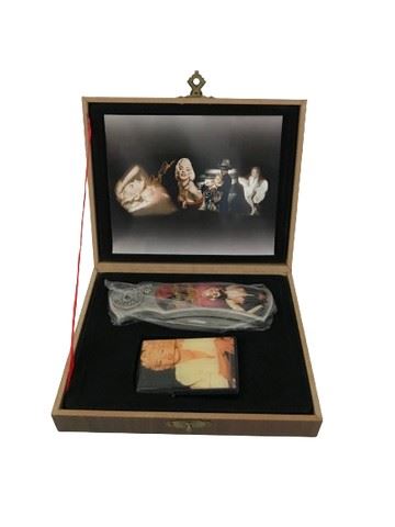 Collectible Marilyn Monroe branded lighter and sealed switchblade in original wooden box display.