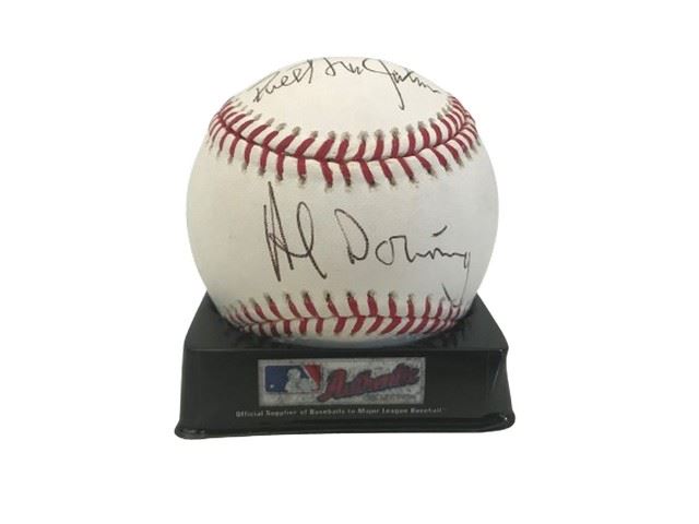This baseball features autographs from Los Angeles Dodgers’ outfielder Tommy Davis, New York Yankees’ Al Downing, Ken Landreaux and Sweet Lou Johnson.