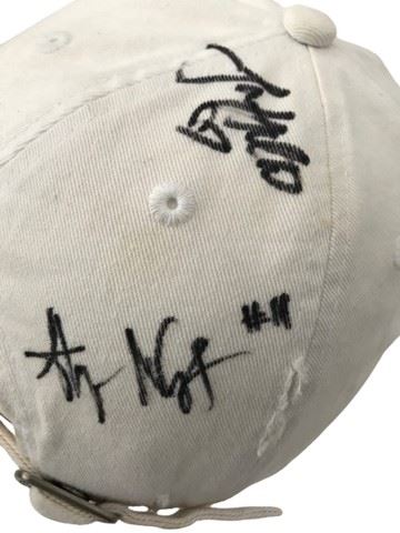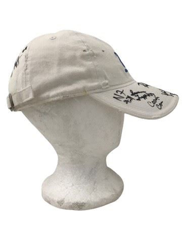 UCLA women’s 2013–14 Bruins women's basketball team white and blue embroidered baseball hat. Signed by Paulina Hesler, Thea Lemberger, Kari Korver, Corinne Costa, Madeline Poteet, Nora Fields, Coach Cori Close, Atonye Nyingifa and more.