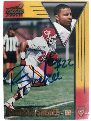 1998 #82 Rashaan Shehee Kansas City Chiefs autographed Aurora football rookie card. Hand signed with #22.