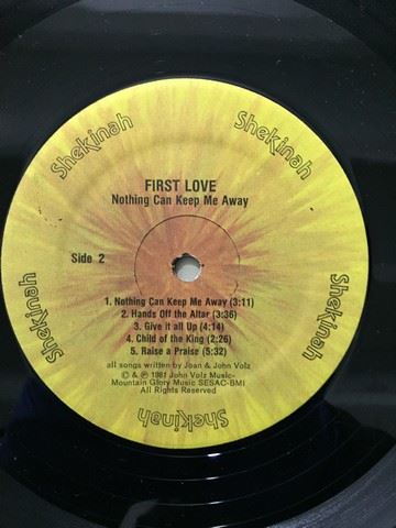"First Love, Nothing Can Keep Me Away" (1981) autographed vinyl record. 9 songs between both sides. Songs include "Closer to the Light", "Give It All Up", "Raise a Praise", etc. Autographs from all members of First Love are written on the back cover.