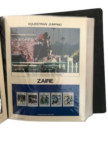 Postal Commemorative Society, 1984 Olympic Games Philatelic Panels. Includes original introductory page from the Commemorative Society, each panel details event and country of origin, covered in protective plastic sleeves. 90 total panels. Included a page for each country and their respective Olympic stamps. Each page is protected by plastic.