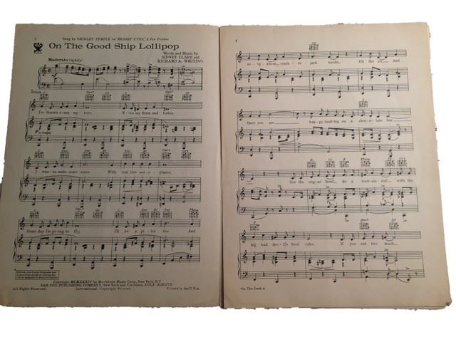 Shirley Temple Sheet Music: Dimples (1936), On The Good Ship Lollipop (1934), Picture Me Without You, set of two. (12x9)