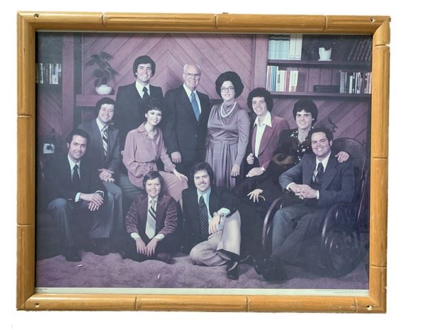 The Osmond Family portrait (from the Osmond newsletter subscription), framed and signed. This was once hung in the Debbie Reynolds Dance Studio. Signed by Marie, Donny, Jay, Jimmy, Merrill, Wayne, Alan, Virl, Tom and their parents: George and Olive. Signatures have faded over time. (23"x18")