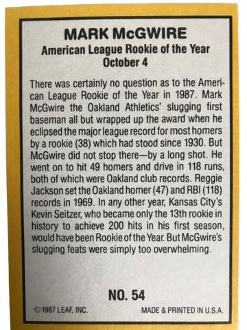 1987 Donruss Mark McGwire A's rookie card. American League Rookie of the Year October 4. No. 54. Leaf Inc.