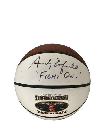 Ball is signed “Andy Enfield ‘fight on!’ on white face of basketball. Beneath the signature is a printed logo for University of Southern California Basketball Trojans SC, with large “TROJANS” logo printed in red and black.