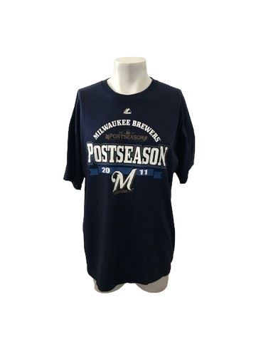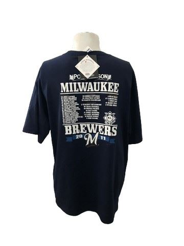 Milwaukee Brewers T-shirt. T-shirt features 2011 Milwaukee Brewers lineup on rear and post season 2011 logos on the front. Original tag still attached. XL. Navy. Majestic brand.