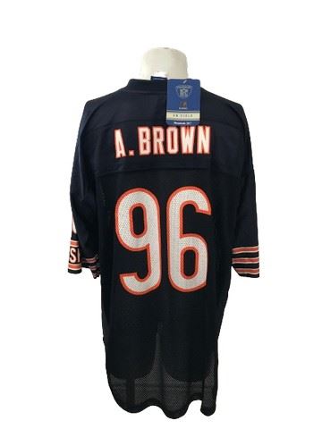 Alex Brown Chicago Bears #96 navy, white, and orange Reebok on field NFL equipment jersey.