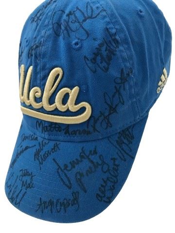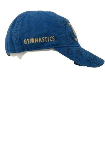 UCLA gymnastics circa 2014 blue Adidas baseball hat with embroidered logo. Signed by Jennifer Pinches, Alex Waller, Angi Cipra, Danusia Francis, Jessy MacArthur, Hallie Mossett, Sophia DeJesus, Mikaela Gerber and others