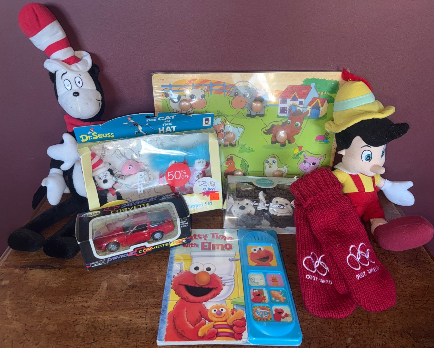 Lot 100 New Farm Yard Wood Puzzle Dr.Suess Finger puppets Elmo Interactive Book & More