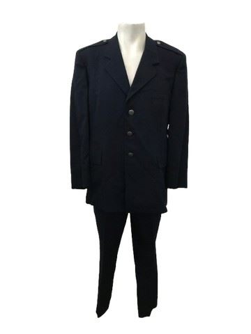 Species II (1998) - Patrick Ross (Justin Lazard) screen worn, clean, pre-bloody military navy blazer with matching pants. Includes a costume department wardrobe tag as well as a studio tag that says "pre-spot for fake blood".