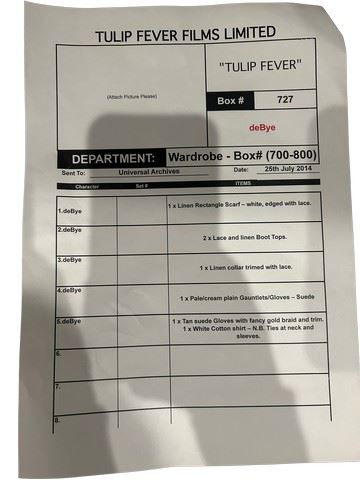 Johan De Bye (Kevin McKidd) screen worn, tan suede, tall, custom made riding boots (approximate size 41), linen rectangle scarf with white lace on the edge, two lace and linen boot tops sewn into the boots, a linen collar trimmed with lace, pale cream, plain, gauntlets/ gloves and tan, suede gloves with fancy gold braid and trim. Includes a costume department wardrobe continuity page.