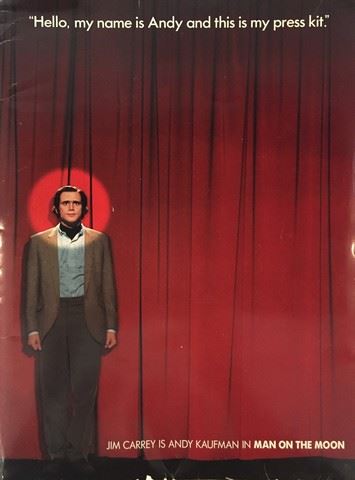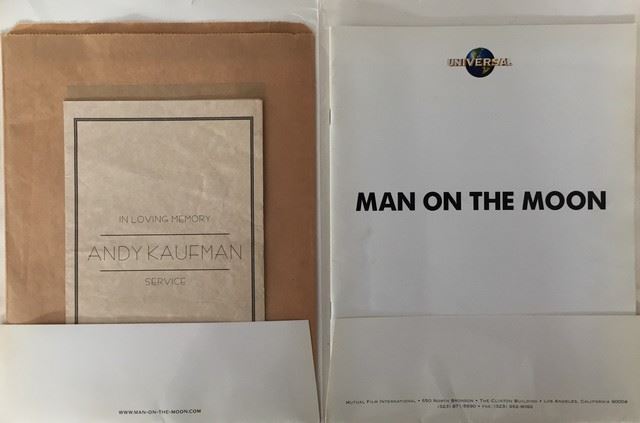 Man on the Moon - Original press kit from Jim Carrey's "Man on the Moon" (the story of Andy Kaufman). Comes with a letter of provenance from David Defino who is an Academy Award winning effects artist and Emmy winning lighting technician. He was the foreman at Gene Young Effects and worked on many amazing, iconic movies and commercials as well as special government projects and private industry and museums. (9x11)