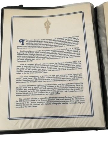 Postal Commemorative Society, 1984 Olympic Games Philatelic Panels. Includes original introductory page from the Commemorative Society, each panel details event and country of origin, covered in protective plastic sleeves. 90 total panels. Included a page for each country and their respective Olympic stamps. Each page is protected by plastic.