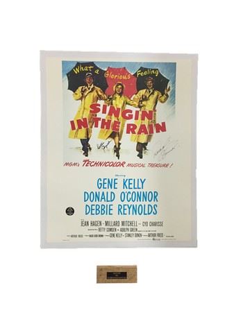 Singing in the Rain (Metro-Goldwyn-Mayer, 1952) Half Sheet. Starring: Gene Kelly, Donald O' Connor, and Debbie Reynolds. Autographed by Debbie Reynolds and Donald O' Connor. Near Mint. (29.75" X 32.75"). Cotton canvas linen-backing. Paired with a piece of the original, wooden dance floor from Debbie Reynolds Dance Studio, with a custom engraved "Debbie Reynolds Dance Studio" plate (3.5"x 6.25"). This amazing memorabilia comes direct from the Debbie Reynold's archive collection.