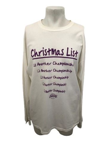 This holiday themed Los Angeles Lakers long-sleeved features an adorable Christmas wish-list on the obverse of the shirt, checking off "Another Championship", listed five times, with "Go Lakers" printed along the length of the left sleeve.This Gildan long-sleeve t-shirt is white with purple screen printing. Sized Extra Large.
