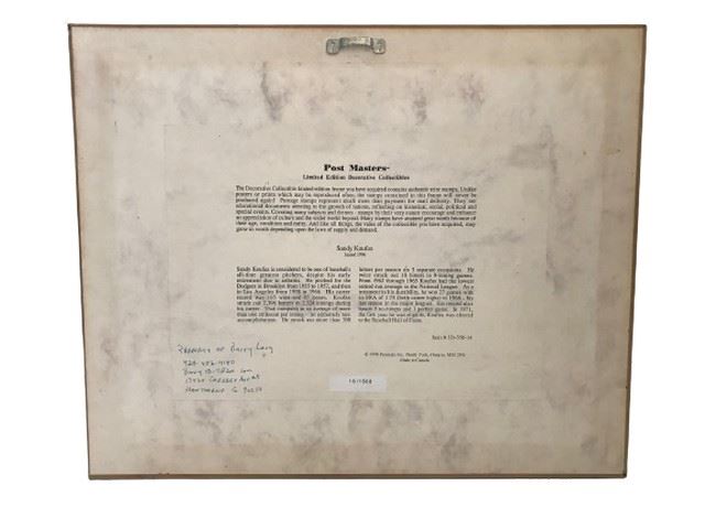 Sandy Koufax 1996 Postmasters Limited edition decorative collectibles frame postage stamp collection. This collection features 12 postage stamps featuring Sandy Koufax numbered 16/ 1500.