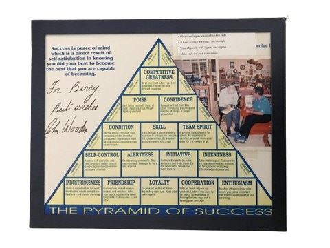 A John Wooden personalized autograph on a pyramid of success motivational poster. Also included is a picture of John Wooden signing this promotional poster for a person named Barry who has kept this in his extensive memorabilia collection. Also includes John Wooden's basketball coach business card.