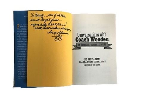 Hardcover first edition of "Conversations With Coach Wooden On Baseball, Heroes, And Life" by Hall of Fame baseball coach Gary Adams.