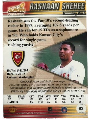 1998 #82 Rashaan Shehee Kansas City Chiefs autographed Aurora football rookie card. Hand signed with #22.
