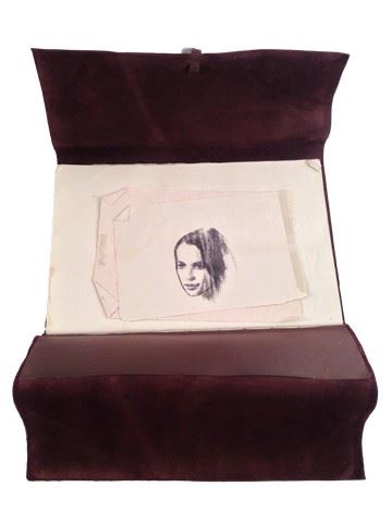 Jan Van Loos (Dane De Haan), screen used, hero, brown leather sketchbook with two loose sketches of Sophia (Alicia Vikander), as well as a couple of sketches of the crucifixion, on heavy parchment type paper. A majority of the pages are blank. (17"x12"x1").