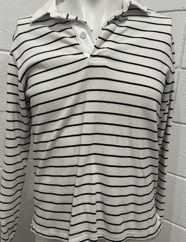 Eddie‘s (Raymond Reid) screen worn, GAP, white and black long sleeve knit polo shirt with thin black, horizontal stripes and solid, white collar and cuffs (size XS), and a pair of Dockers, with low top, lace up tennis shoes with gum sole (size 8). Includes costume department wardrobe tag.