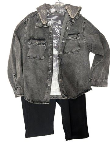 Connor (Raphael Alejandro) screen worn, Unvibe, dark gray short sleeve ombré t shirt with marbling print (size m), Zara, grey stonewashed denim shirt jacket with attached knit tie, dyed hood (size 13–14), with a pair of H&M, dark gray/black jeans (size 12). Includes a costume department wardrobe tag.