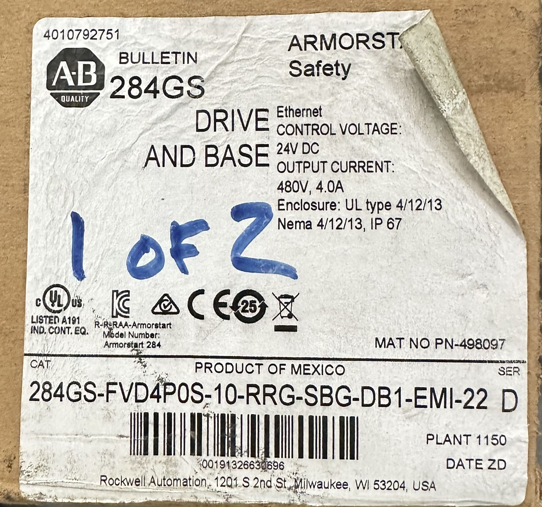 Lot 404 Allen Bradley #284GS-FVD4P0S-10-RRG-SBG-DB1-EMI-22/D ArmorStart Control Module Drive & Base