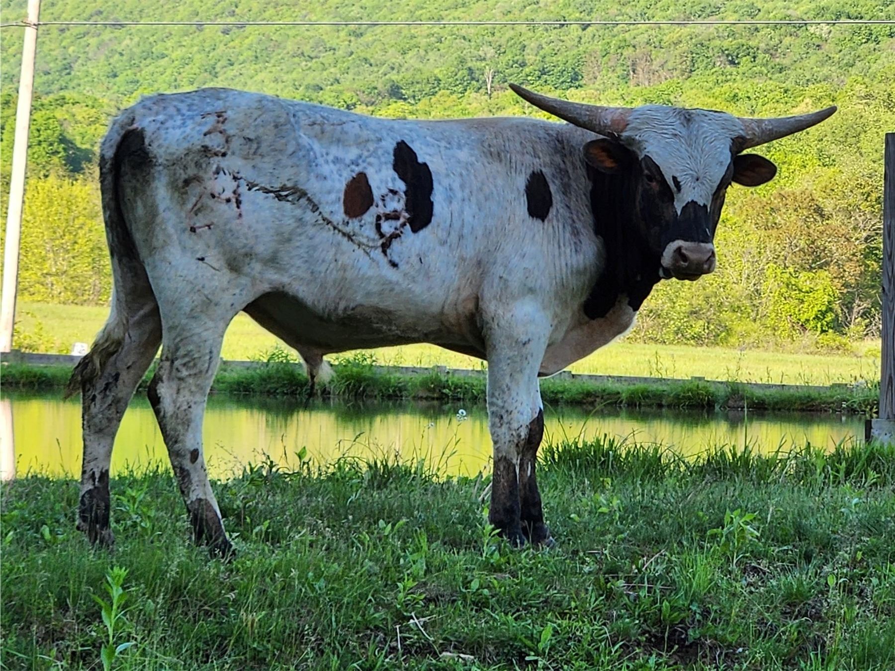 Rough N Tumble is clean and a solid built young bull. He is turning color, and will be a spotted brindle bull, take him home and breed him to your young heifers. his pedigree has lots to talk about. Four 100" animals - Cut N Dried 100" Cowboy Tuff Chex 108" Silent Iron 116" BL Rio Catchit 2x WS Jamakizm 2x Drag Iron Top Caliber. if you want a young starter bull here he is.