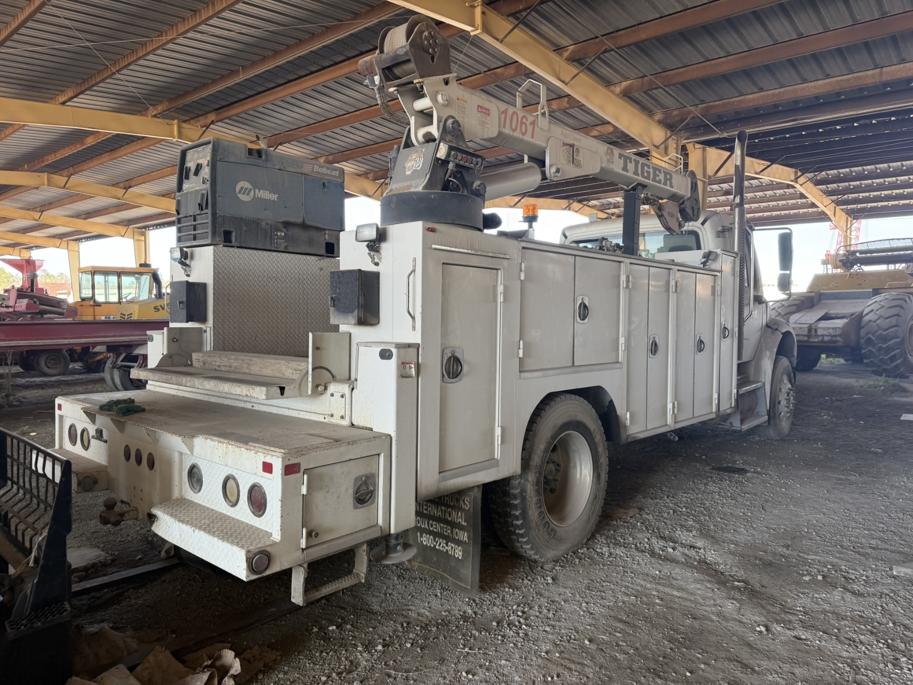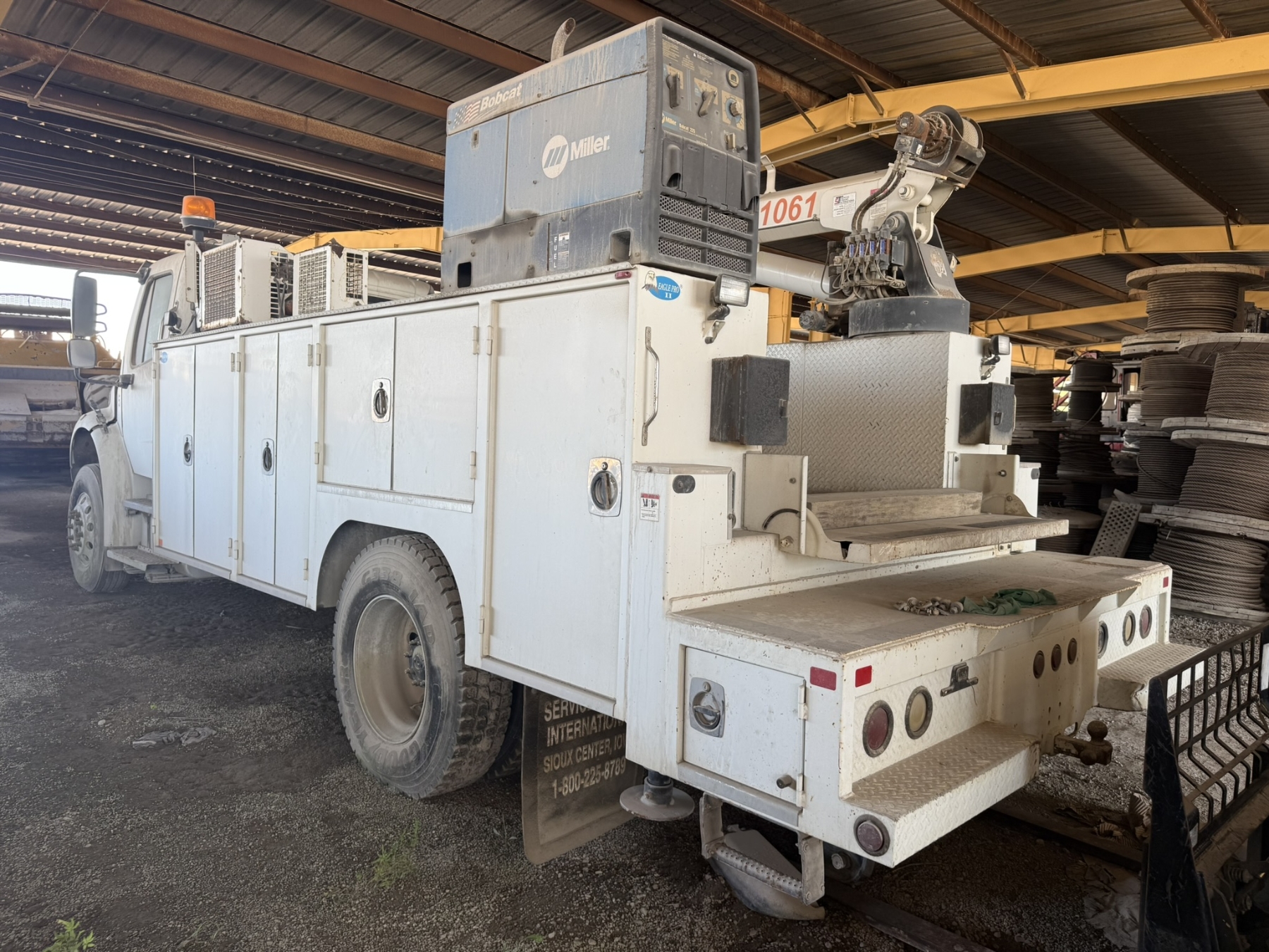 S/A, Cummins ISC engine, Allison A/T, Eagle Pro II service body, Tiger 1061 crane, (2) product tanks, hyd air compressor, Miller Bobcat 225 welder, hose reels, hyd outriggers, workbench bumper