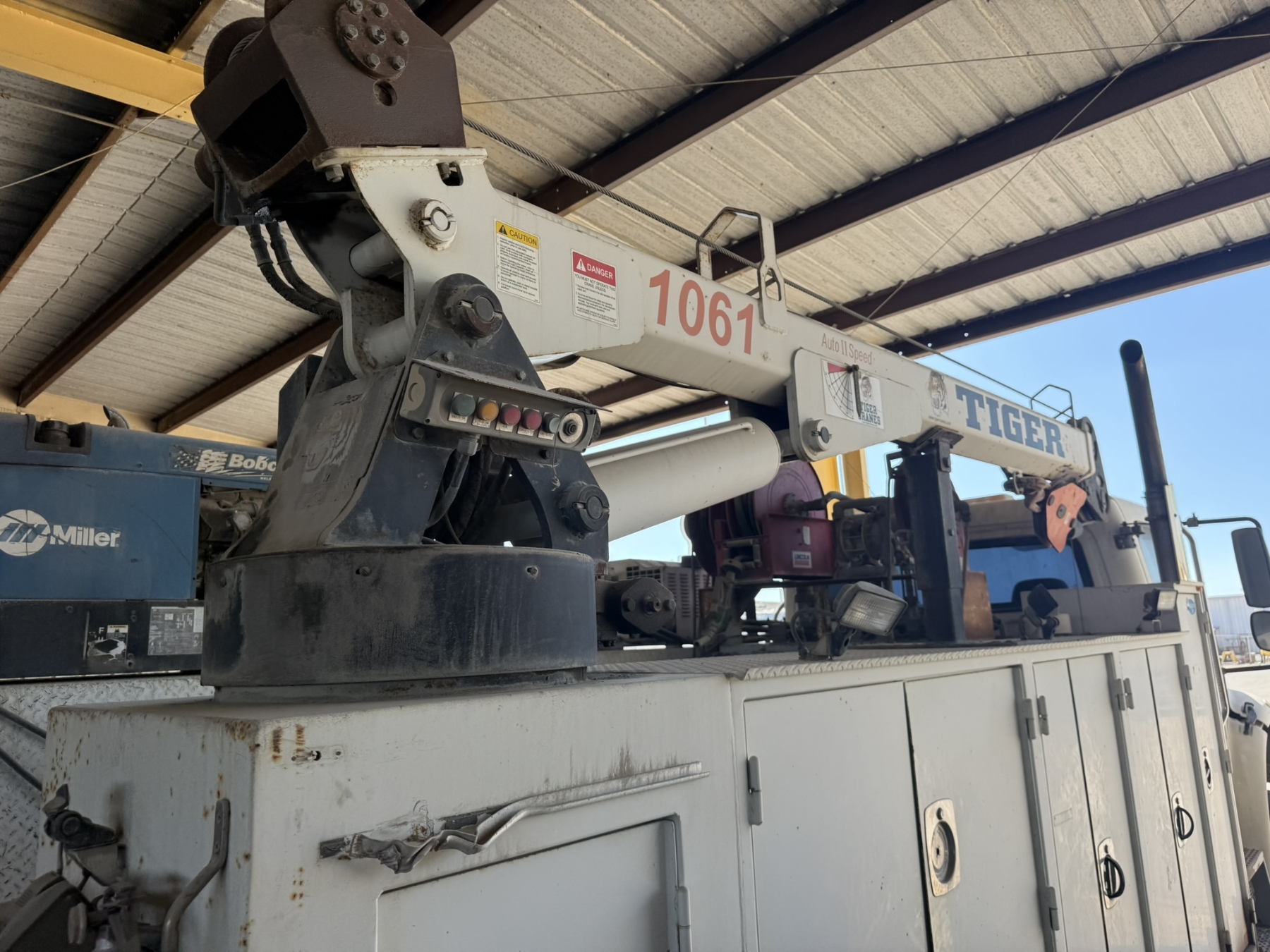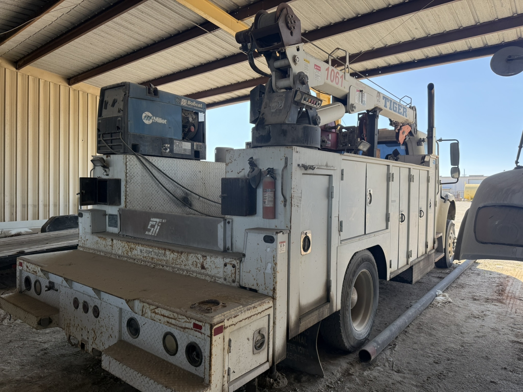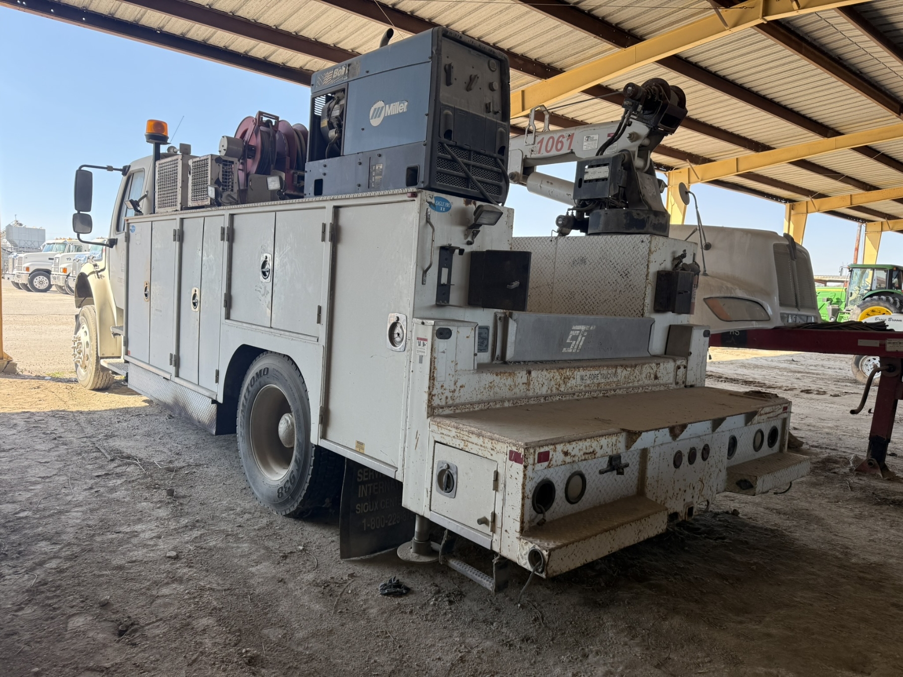 S/A, Cummins ISC engine, Allison A/T, Eagle Pro II service body, Tiger 1061 crane, (2) product tanks, hyd air compressor, Miller Bobcat 225 welder, hose reels, hyd outriggers, workbench bumper