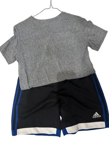 Eddie’s (Ramon Reed) screen worn, gray, short sleeve Cat and Jack branded T-shirt (size L 12/14) with a pair of black Adidas shorts with a blue stripe down the sides (size medium 10/12). Includes costume department wardrobe tag.