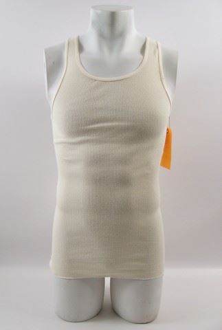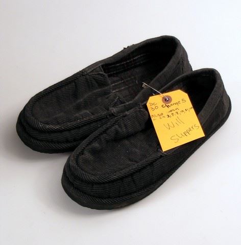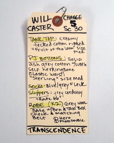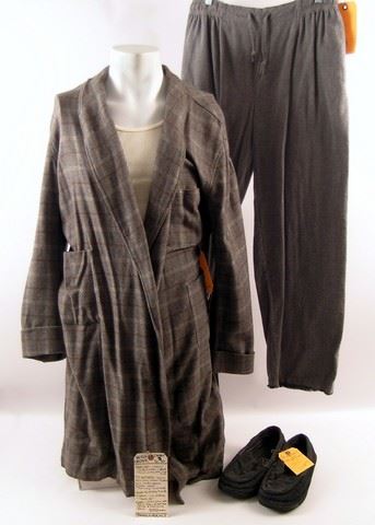 Will Caster (Johnny Depp) screen worn, hero, grey wool with brown and tan box checker print and matching belt robe, cream teched cotton ribbed 'Fruit of the Loom' tank top, (size M) solid ash grey cotton with self herring bone elastic waist 'Sterling' pajama bottoms, (size M) and grey corduroy 'Route 66' slippers. Includes wardrobe tag!